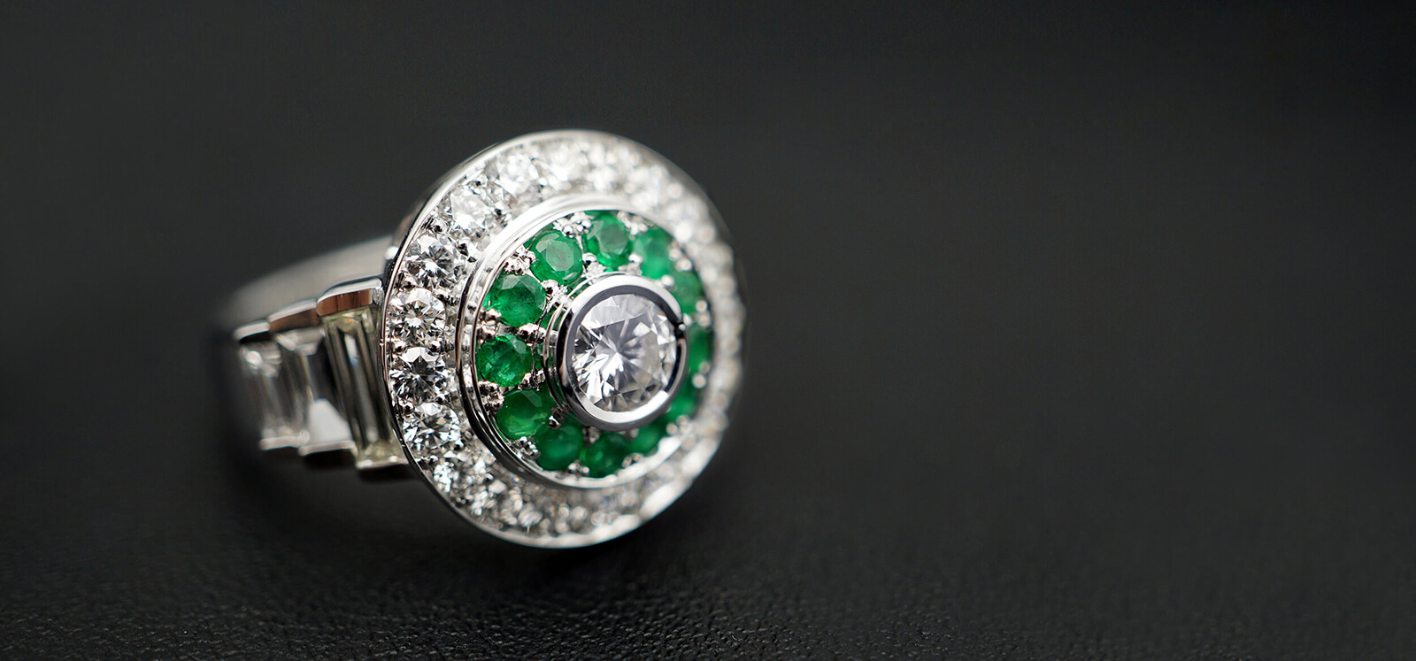 Emerald and Diamond Halo Ring Emerald 0.48 ct. Round Diamond 0.73 ct. Baguette Diamond 0.75 ct. 18K White Gold Other Products. Diamond Ring 18K White Gold More Detail Three Color Gemstones Ring in 9K Yellow Gold Three Color Gemstones Ring in 9K Yellow Gold More Detail Flush Set Diamond Bangle Flush Set Diamond Bangle in 18K White Gold More Detail Diamond Ring Diamond 0.18 ct. Pave Diamond 0.13 ct. 18K White Gold More Detail